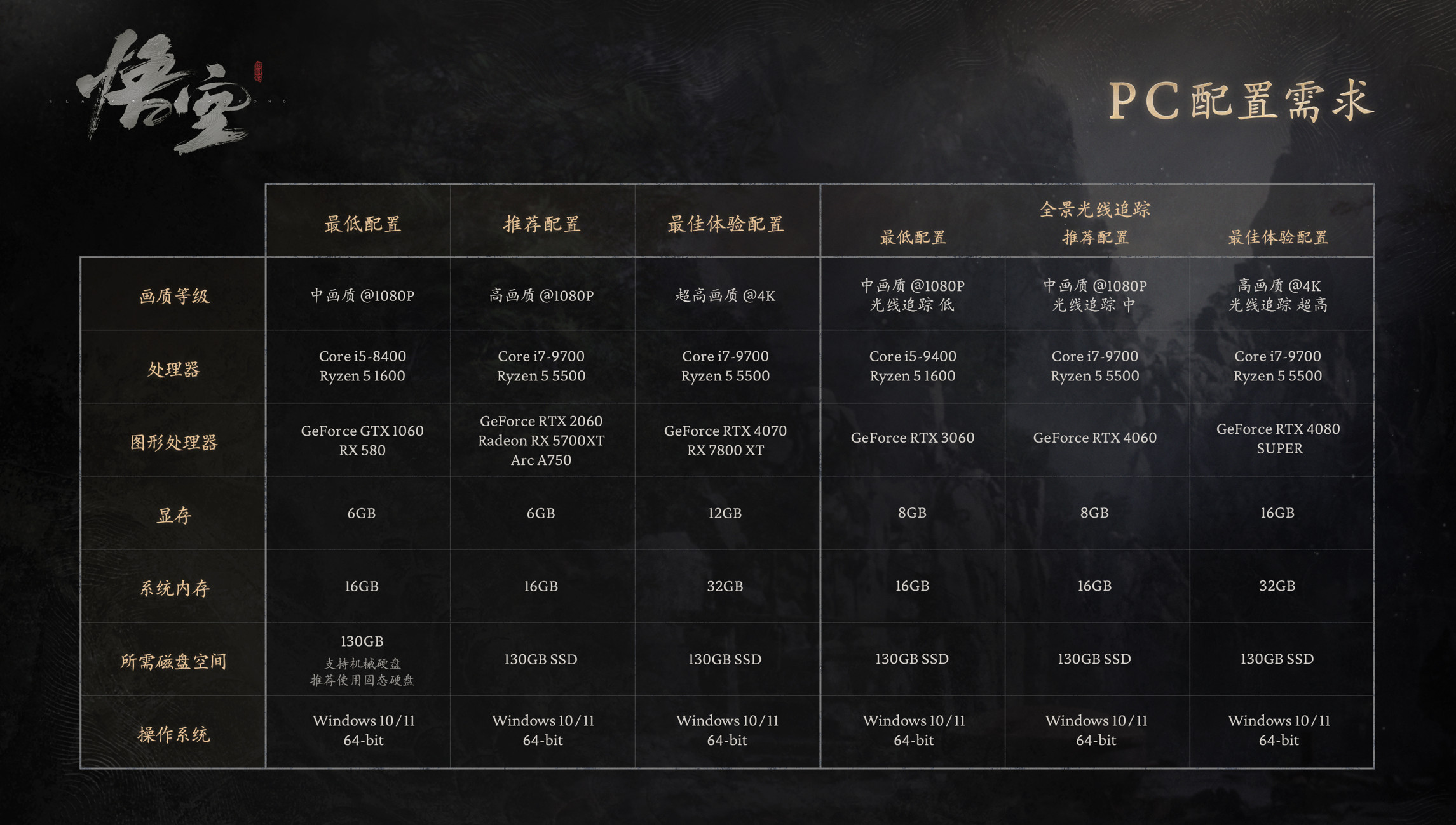 此前官方发布的1080P高画质推荐配置为RTX 2060或RX 5700XT,1080P中画质GTX 1060或RX 580即可。但官方也指出,这些配置都是在启用DLSS/FSR/Xess技术的情况下给出的,因此如果玩家想要体验原生1080P/高画质,实际配置可能需要RTX 3060水平。
