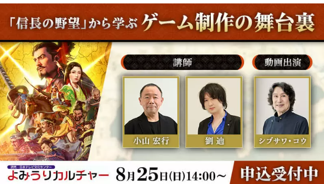 光荣特库摩日前宣布,以旗下经典战略游戏《信长的野望》为主题的游戏讲座《学习游戏制作过程以及开发者的工作讲座》将于8月25日在线发布,系列生父光荣创始人已将登场,敬请期待。