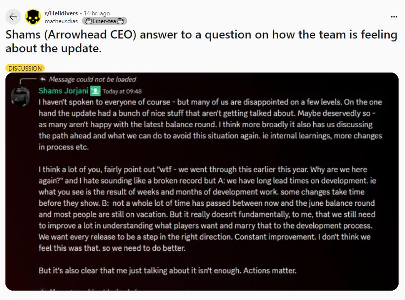 愤怒的玩家再度选择以刷差评的方式“激励”Arrowhead,而首席执行官Shams Jorjani也在Discord频道中对玩家的不满进行了回复,这位CEO表示:“我当然没有和所有人谈过——但我们中的许多人在某些方面感到失望。”