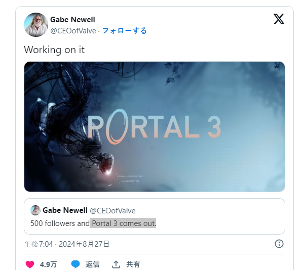·问题在于,实际上G胖根本没有注册包括X在内的多个SNS账号,难怪有不少玩家上当,该假消息已经有4.9万点赞,相信期待《传送门3》的玩家不在少数。