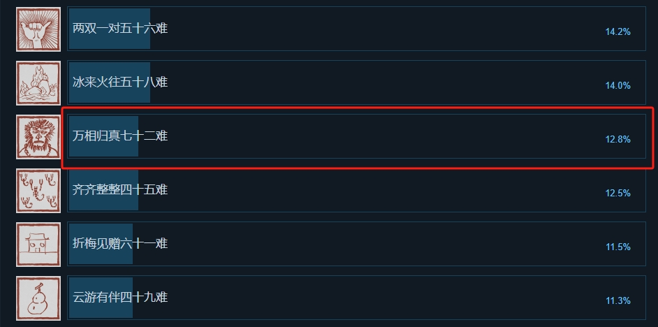 根据Steam上《黑神话:悟空》的成就系统显示,目前解锁了“万相归真七十二难”(即击败了大圣残躯)的玩家仅有12.8%。