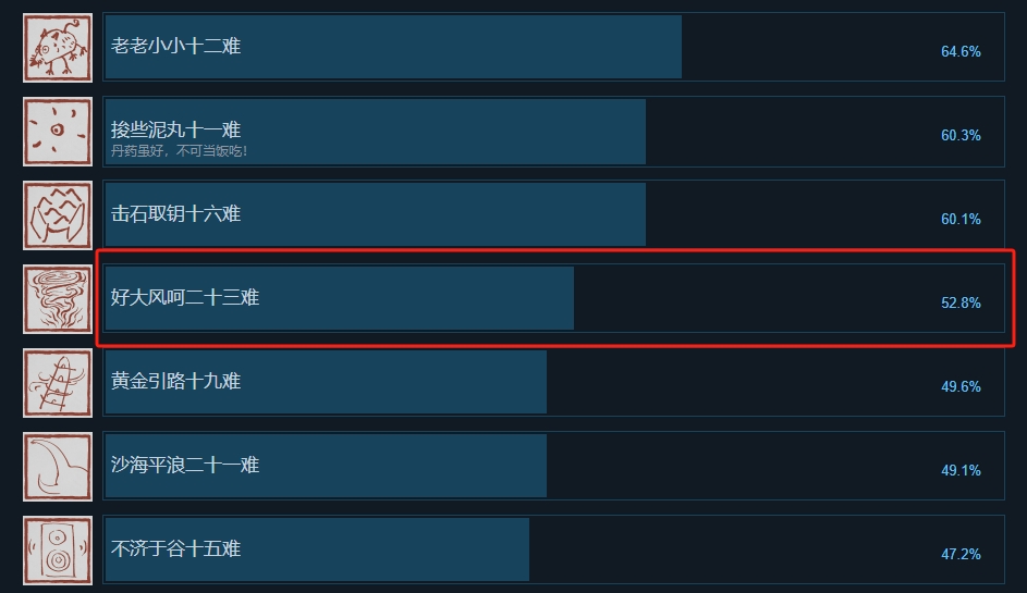 解锁了“好大风呵二十三难”的玩家为52.8%,这是第二章末尾击败黄风怪后获得的成就。而这项数据也意味着,近一半的玩家到了这一步就没能继续走下去了。
