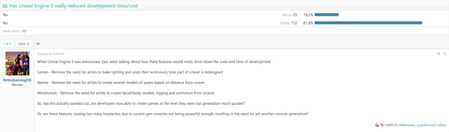 显然许多玩家对虚幻 5 的态度已经从积极转为消极。在英文游戏论坛 NeoGAF 上,一位名叫 RetroGamingUK 的玩家发起了一项投票,询问其他玩家是否认为虚幻 5 引擎有助于减少开发时间和成本。其中,超过 80% 的人都给出了否定答案。