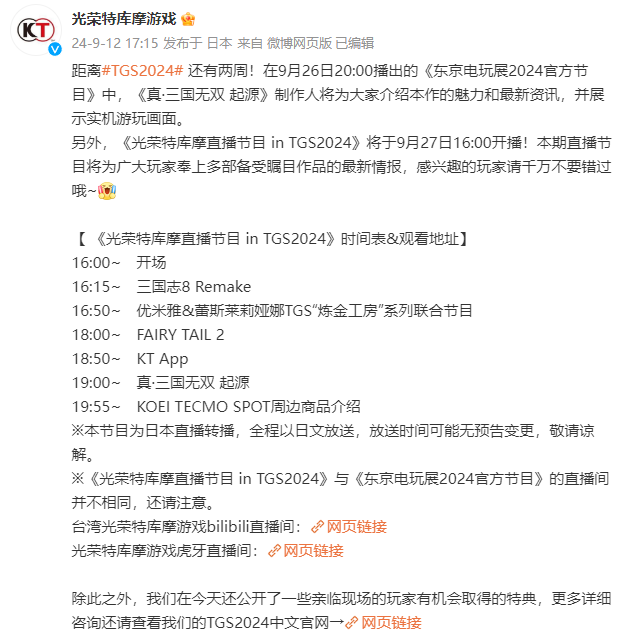 另外,《光荣特库摩直播节目 in TGS2024》将于9月27日16:00开播,本期直播节目将为广大玩家奉上多部备受瞩目作品的最新情报。注意,光荣特库摩直播节目 in TGS2024》与《东京电玩展2024官方节目》的直播间并不相同。