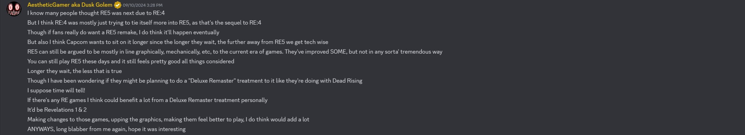 虽然如果粉丝真的想要《生化危机5》重制版,我认为它最终会实现,但我也认为Capcom希望再等等,因为等待时间越长,技术上就越远离《生化危机5》重制版。