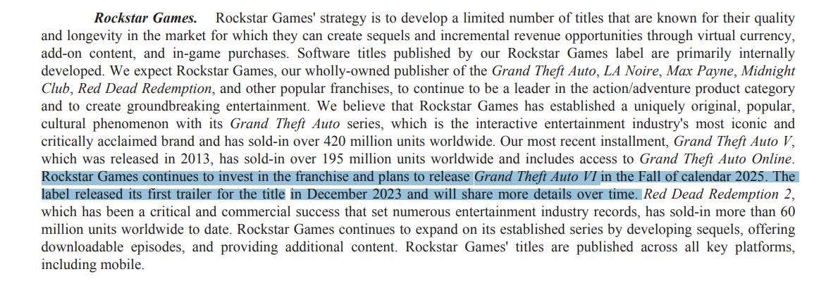 Take Two在2024年年度报告中指出:“R星将继续投资该系列,并计划在2025年秋季发售《GTA6》。该作在2023年12月发布的首个预告片,并将随着时间的推移分享更多细节。”