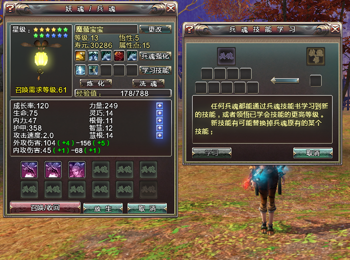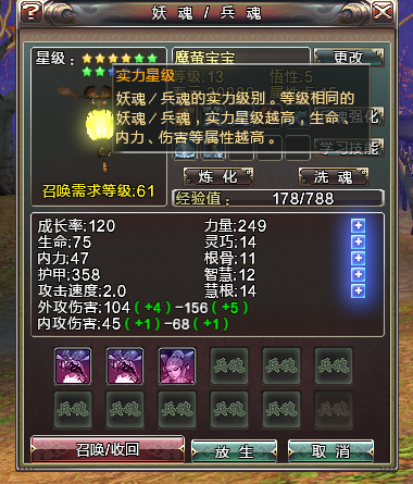 在学习技能前,最好用“洗魂水”把宝宝成长率洗炼到210后,在进行强化和升级操作,不然的话会前功尽弃的!宝宝洗炼好之后就可以寻找自己心仪的兵魂书进行学习了~