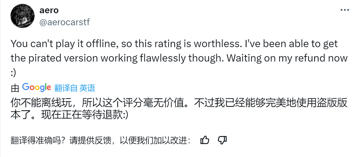 还有更狠的老哥:你没法离线玩,所以这个验证毫无意义,不过我已经能够完美地玩盗版版本了。现在正在等待退款:)