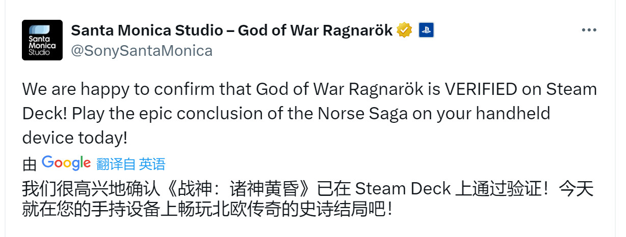 圣莫尼卡官推宣布《战神:诸神黄昏》已经通过了SteamDeck验证,现在玩家可以在这一手持设备上游玩北欧传奇史诗最终章。