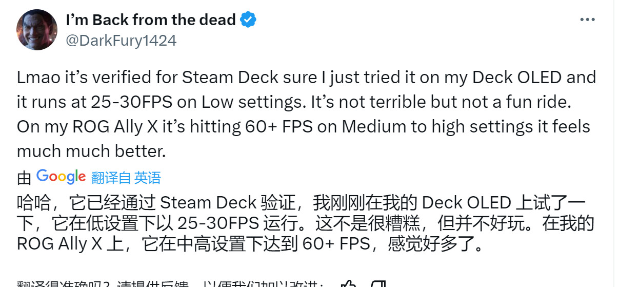 也有玩家称刚刚在Steam Deck上试了试,低画质只有25-30FPS,虽然不是很差,但体验绝对不算好。在他ROG Ally X上,中高画质能达60+FPS。
