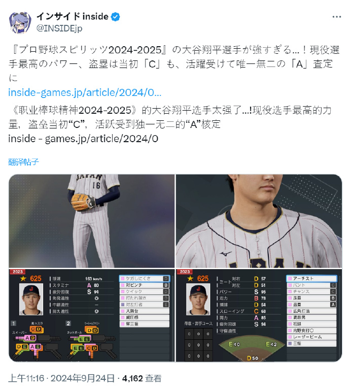 这不,最近在《职业棒球之魂 2024-2025》中,官方就对球员大谷翔平的能力值进行了大幅增强。原本设定的“盗垒能力C级”,被紧急调整为了“A级”。