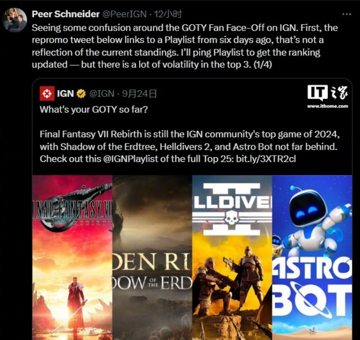 面对网上的质疑,今日IGN联合创始人Peer Schneider,在社交媒体平台上做出了回应。他表示公司并没有改票数,只是过滤了一些机器人。当然,IGN如何判断哪些是机器人投票并进行剔除,外界就不得而知了。