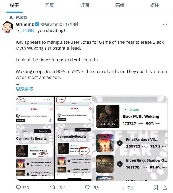 前魔兽制作人Grummz公开吐槽IGN作弊。他在置顶动态中表示:“IGN操纵了年度游戏的玩家投票,以消除《黑神话:悟空》取得的巨大优势。看看时间和计票结果,《悟空》在一小时内得票率从90%跌到了74%。他们在凌晨五点做了这件事,当时大多数人都在睡觉。”