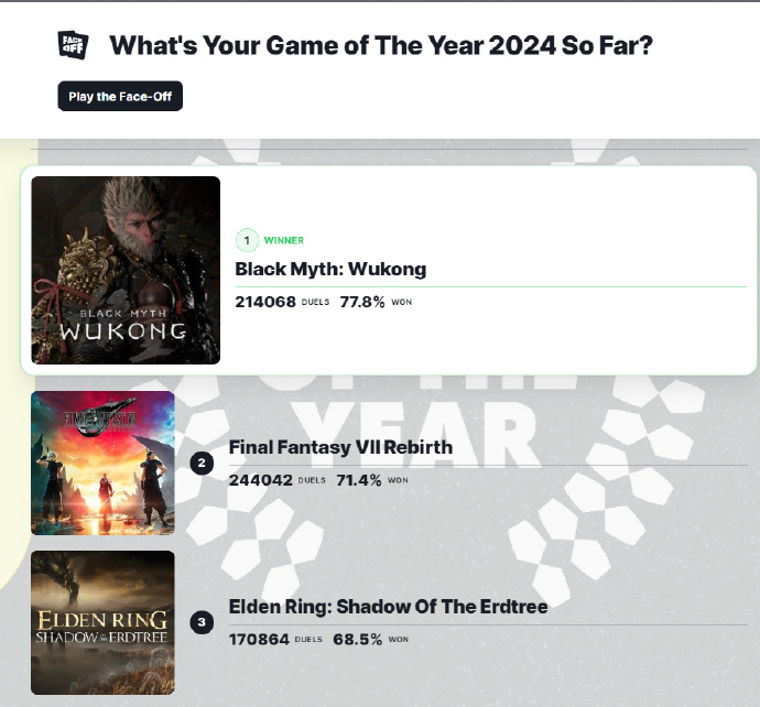 几天前,IGN开启了关于年度最佳游戏评选的玩家投票。诸多有影响力的优秀作品纷纷上榜,并凭借玩家喜好排起了座次。经过连日交锋,国产3A大作《黑神话:悟空》力拔头筹,以超过90%的得票率高居榜首。