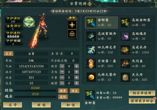 《大话3经典版》新服开服的第1-9周,达到50级的少侠即可参与新服专属守护养成活动【云霄同游】,领取新服专属高级守护·云霄,通过完成活动任务,还可获得修炼心得用于养成云霄各项属性和技能,大幅增强其战斗能力,为少侠的新服之路保驾护航。