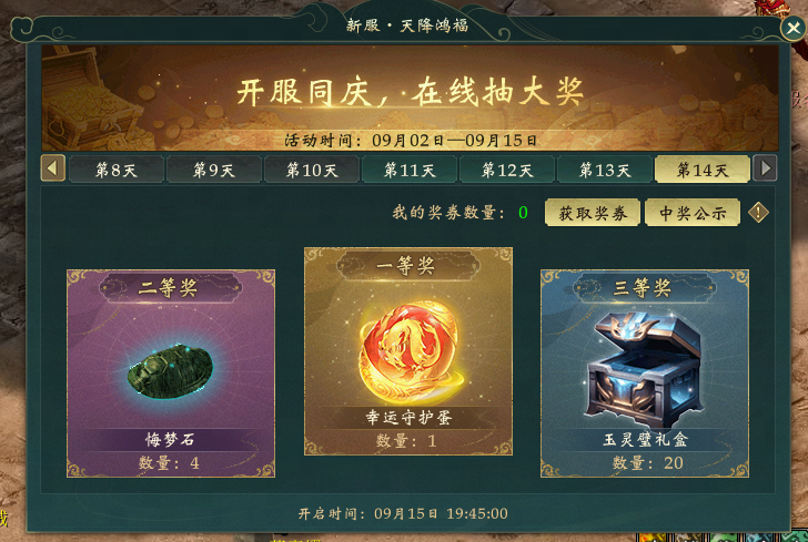同时,开服同庆,来新服更能在线抽大奖,在新服开服的第1-14天,达到50级的玩家每天完成任务即可获得天降鸿福奖券,参与当晚的【天降鸿福】活动,有机会获得得超级守护蛋、武侯秘典等豪华大奖,且每天晚上在线均可享受经验雨奖励!