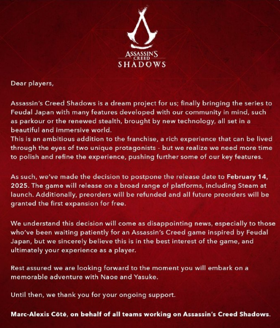 今日凌晨,育碧宣布取消“2024年东京游戏展”官方节目计划。紧随其后,又是一系列大动作。已经开始宣发工作许久的《刺客信条:影》正式确认延期,从今年11月15日推迟至2025年2月14日发布。同时,董事会也将对育碧进行审查,以解决目前的困境。