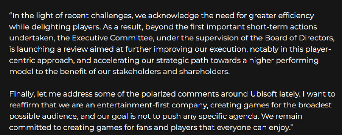 “最近围绕育碧的一些两极分化的评论。我想重申,我们是一家娱乐至上的公司,为最广泛的受众创造游戏,我们的目标不是推动任何特定的章程。我们将继续致力于为粉丝和玩家创造人人都能享受的游戏。”