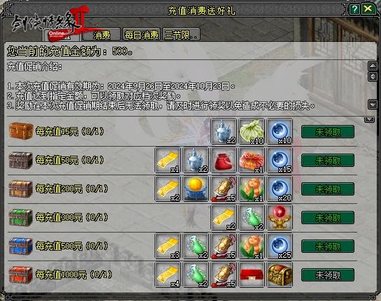 9月26日9:00,9月充消活动开启!参与充值消费活动即可享受充值奖励、消费奖励、每日消费奖励,及特别的限时消费奖励哦,有各种等级直升丸子、经脉丹,大量侠心万里抽奖券等赠送,助力每位大侠成长。充值多多,奖励多多!