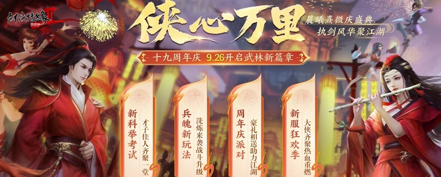 西山居经典剑侠情缘系列游戏--《剑网2》今日发布十九周年庆资料片“侠心万里”!本次资料片将带来科举考试焕新版、兵魄洗炼玩法、周年庆派对、资料片充消巨献等丰富内容,十九周年新服“苍龙逐日”9月26日15:00火爆开启,十大福利活动助飞江湖,邀您一起共庆欢乐时光,开启武林新篇章!