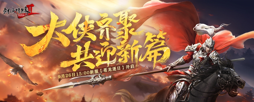 大侠齐聚,共迎新篇!9月26日下午15:00,十九周年新服“苍龙逐日”准时开服,十大新服活动,福利加码历程调优,这一次轻松启程!新服开启后,我们也将在微信公众号每晚开启新服直播,助大侠快乐江湖,轻松不迷茫!