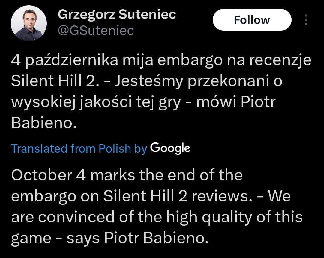 《寂静岭2:重制版》的开发者信心十足,他们认为这款游戏的质量很高。Bloober Team首席执行官Piotr Babieno表示:“我们坚信《寂静岭2:重制版》是高品质游戏。参与重制工作的每个人都对其很满意。”