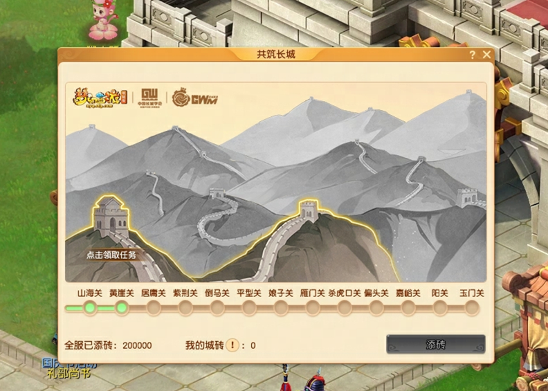 ¡¡¡¡Áª¶¯»î¶¯ÆÚ¼ä£¬¡Ý50¼¶µÄС»ï°éÁìȡ̫Çå·û10¡¢25¡¢40¡¢60µÄ½ø¶È½±ÀøÊ±£¬¿ÉÒÔ»ñµÃ¡°³¤³Ç³Çש¡±¡£»ñµÃ³Çשºó£¬´ó¼Ò¿ÉÒÔµã»÷ÍòÀﳤ³ÇNPCÑ¡Ïî¡°¹²Öþ³¤³Ç¡±´ò¿ª¹²Öþ½çÃæ£¬ÉϽ»³Çש£¨ÐèÏûºÄ20µãÌåÁ¦/¿é£©£¬Îª¹²Öþ³¤³Ç¹±Ï×Ò»·ÝÁ¦Á¿¡£
