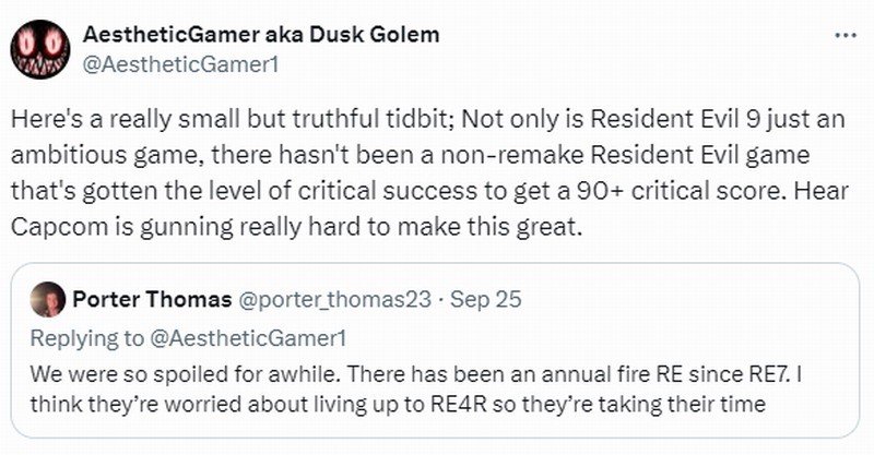 Dusk Golem继续说:“我知道有人会说:‘他们当然想做一款好游戏’,但我的意思是,他们很清楚在《生化危机4》原版之后,还没有一款主流非重制版作品在Metacritic上达到90分以上。他们希望《生化危机9》能被媒体和玩家们视为一款顶级作品。”
