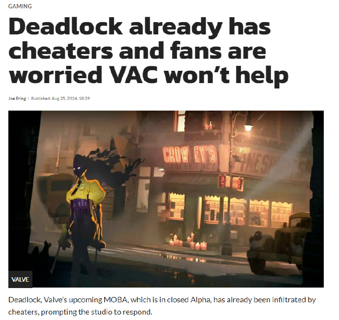 不过在测试过程中,《Deadlock》也曝出了一些隐患,那就是射击游戏所无法规避的外挂问题。随着玩家数量的提升,很多人都开始在对局中遇到了作弊玩家。他们的存在严重影响到了对局体验,但因为游戏还未正式上线,所以大家对于V社的反作弊并没有抱太大希望。