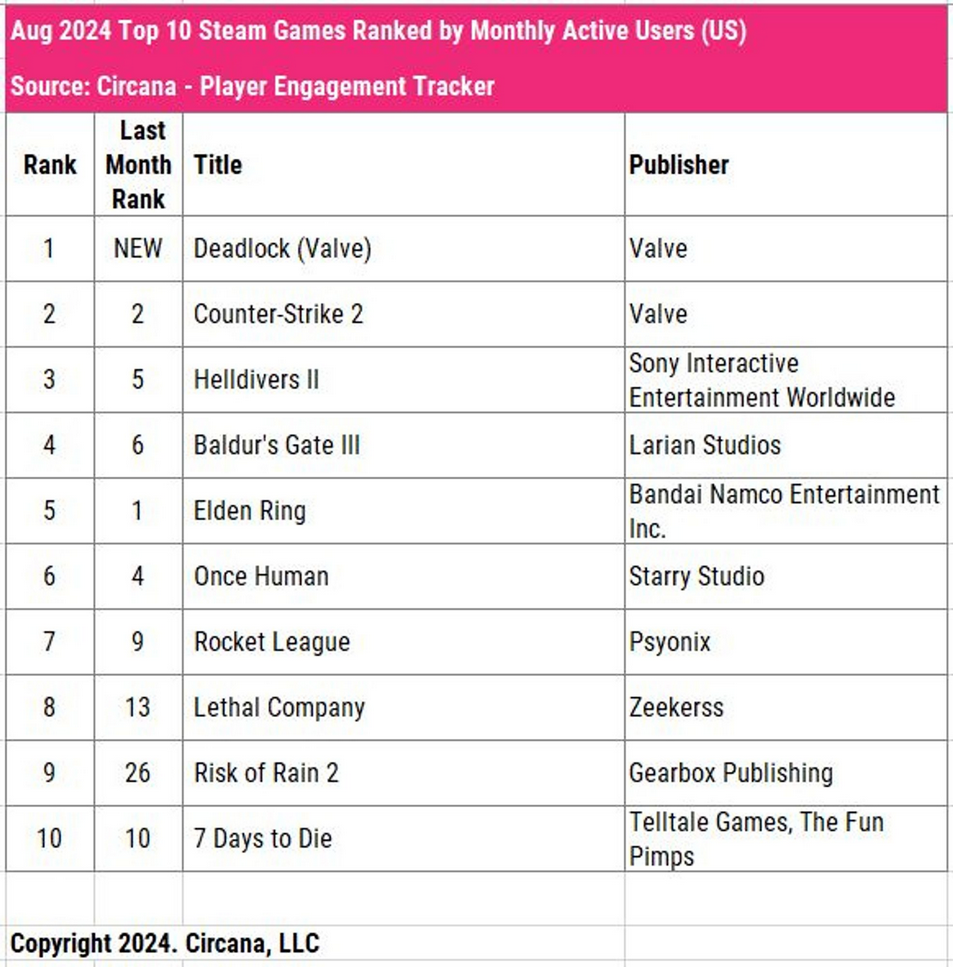 根据市场分析团队 Circana 的最新数据显示,美国 Steam 8 月活跃用户数量最多的游戏是 V 社还未正式发布的《Deadlock》。