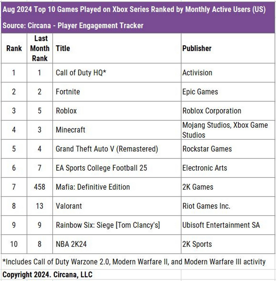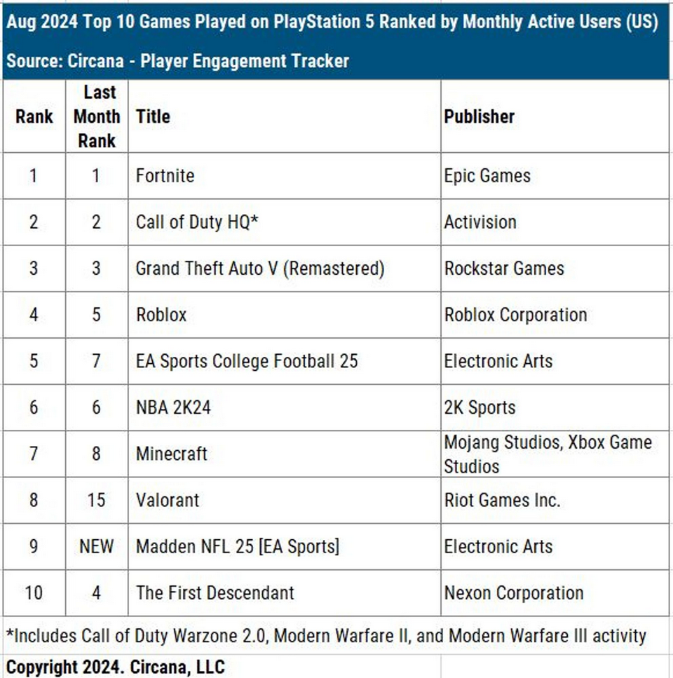 在其他平台(PS5 和 Xbox Series),大多数登榜作品都是老面孔,像是《使命召唤》、《堡垒之夜》、《罗布乐思》、《GTA 5》和《我的世界》等。唯一登榜的新作是《麦登美式足球25》,在 PS5 排名第 9 位,Xbox Series 排名第 11 位。