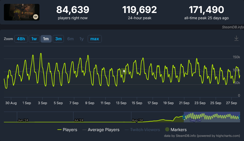 在社交媒体 Bluesky 上,分析师 Mat Piscatella 分享了 Circana 的最新排行榜。直到 8 月底 V 社才正式披露这款仍然以邀请制进行测试的 Moba + TPS 游戏,在此之前它的玩家人数已经超过 1.8 万人,但是公开并允许直播后,这款仍在测试中的游戏创下了 17 万同时在线玩家的纪录。
