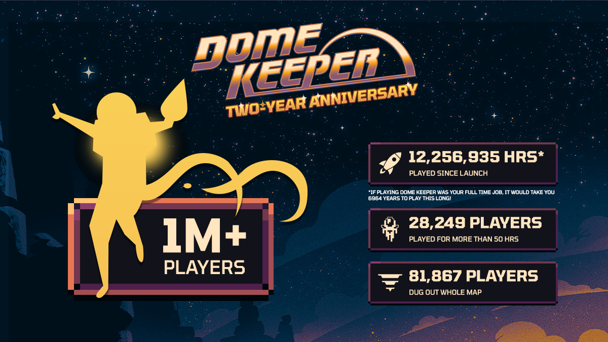 在 Steam 上,开发商 Bippinbits 宣布,其于 2022 年推出的肉鸽挖矿波次防御游戏《穹顶守护者(Dome Keeper)》目前销量已经达到 100 万份。昨天(9 月 27 日)还标志着游戏的 2 周年纪念日。
