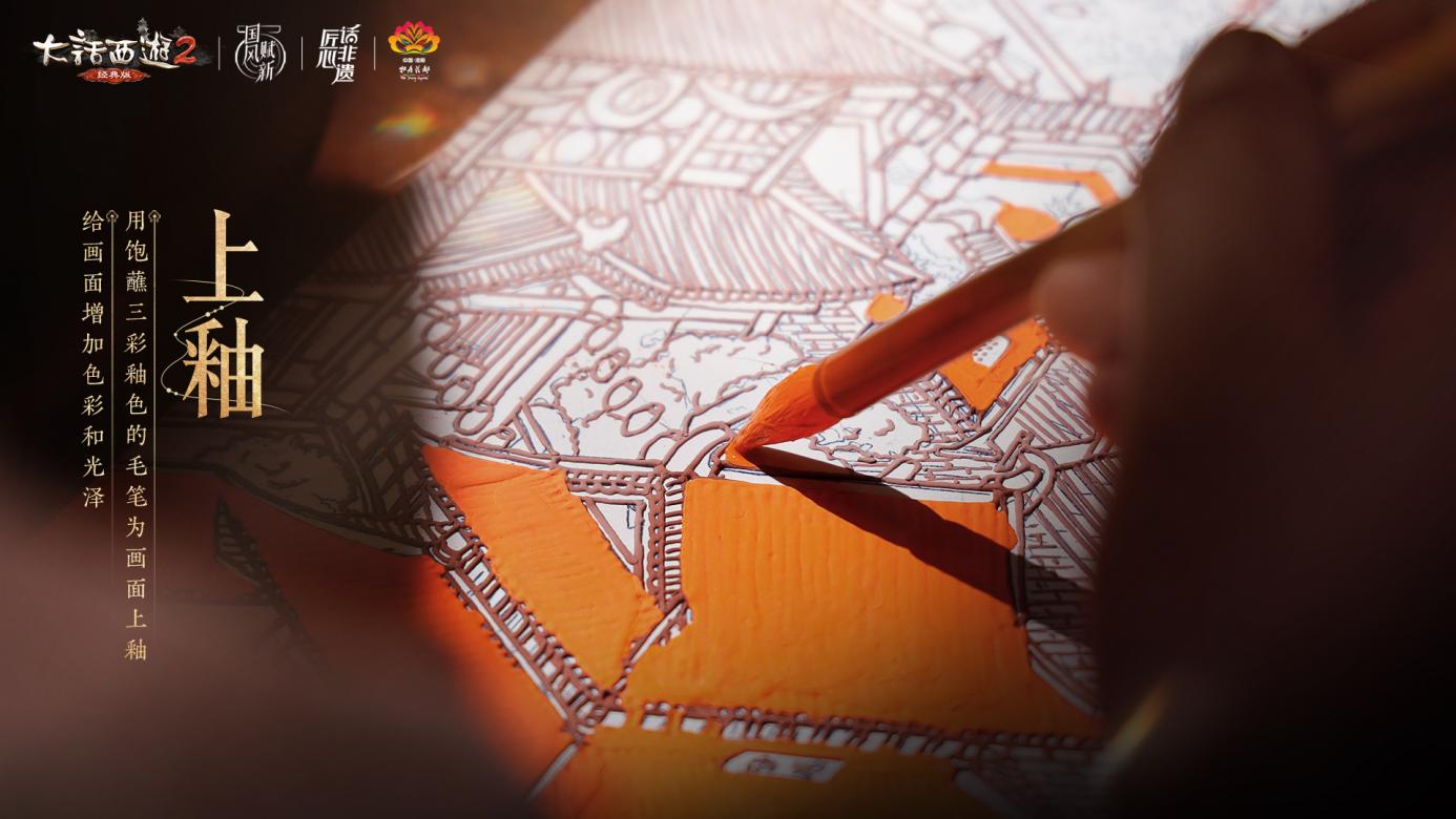 洛阳三彩壁画的制作,要经过画稿、立线、上釉、烧制等多个流程,使用特制的高白纯度陶瓷泥、手工制成的瓷板以陶泥立线,以饱蘸三彩釉色的毛笔上釉,经过1100度中温烧制8小时后,冷却12小时至常温时出窑。