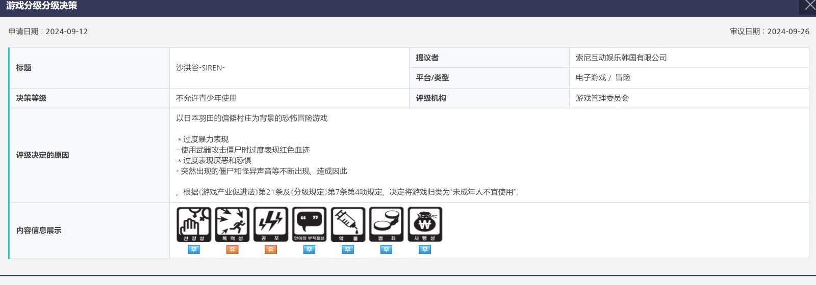 两天前《Siren》重启版在韩国分级委员会完成评级