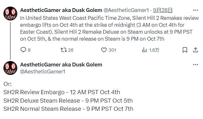 根据知名爆料人Dusk Golem在X上透露的消息称,《寂静岭2:重制版》的媒体评分将于北京时间10月4日下午15:00解禁,购买了豪华版的玩家可以北京时间10月6日中午12:00进入游戏,而游戏的正式版将于10月8日中午12:00解锁。