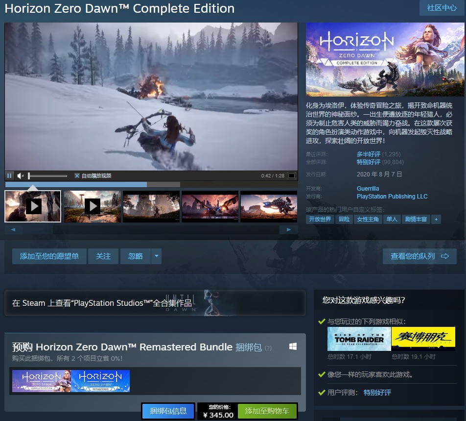《地平线:零之曙光重制版》已在Steam上架,国区售价345元,11月1日发售。现在索尼已从Steam和Epic下架了《地平线:零之曙光》原版,并要求想购买重制版的玩家必须使用PSN账户。