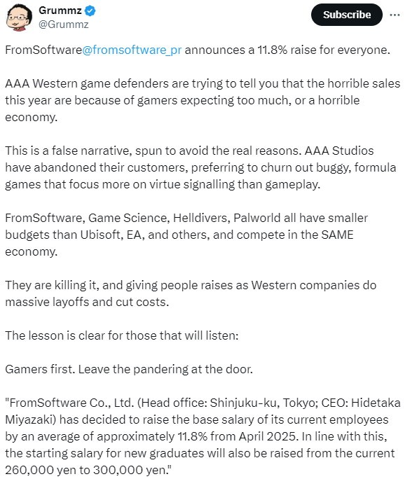 马克·克恩表示,FromSoftware宣布为全体员工加薪12%的时候,西方游戏工作室却试图让玩家相信,今年糟糕的游戏销量是因为玩家期望过高,或是经济不景气。