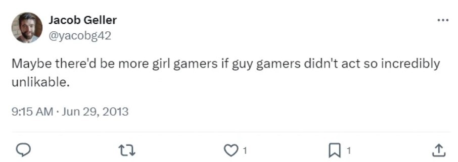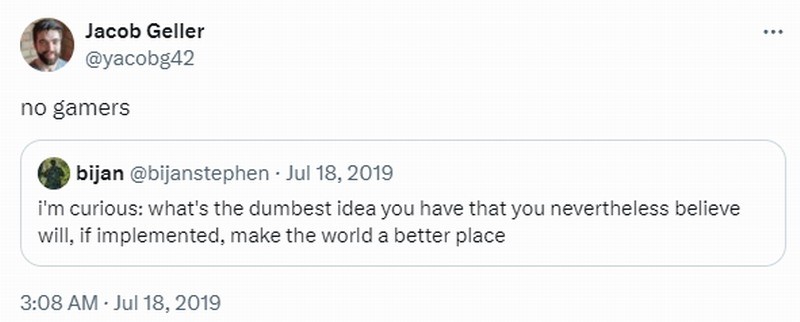 早在几年前,Jacob Geller曾回复过Compulsion Games编剧Bijan Stephen的一条推特。Bijan Stephen表示:“我很好奇,你最愚蠢的想法是什么,但你相信如果付诸实施,会让世界变得更美好”,对于该问题,Jacob Geller简单回复称:“没有游戏玩家”。