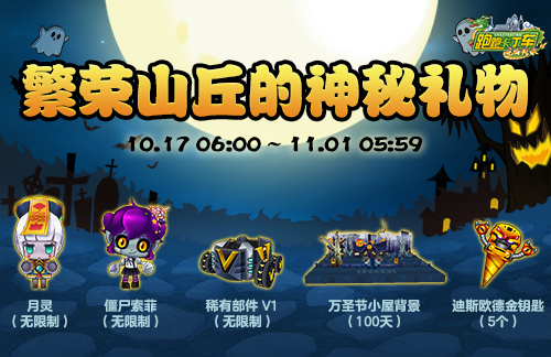 在10月17日 06:00至11月1日05:59期间,<繁荣山丘的神秘礼物>限时回归!活动期间内,在商店内进行兑换或每日完成一次<万圣节挑战赛>内的任务,亦或是在10月17日06:00至10月23日21:59内每日完成一次<僵尸觉醒>内的任务,均可获得“繁荣山丘的神秘钥匙”~