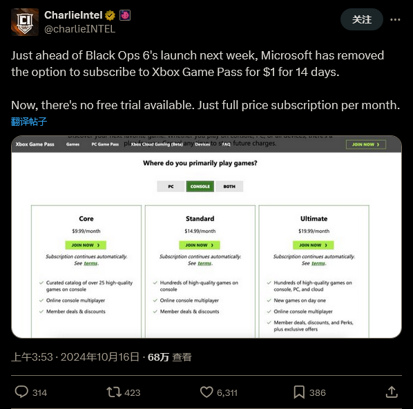 这不是微软第一次干出这件事。去年《星空》发布前,XGP 也暂停了 1 美元的试用优惠。
