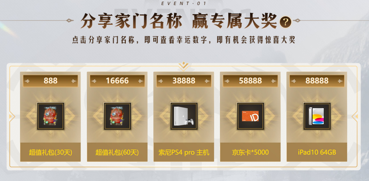 前往《黑色沙漠》国服官网即可参与家门昵称创建活动,完成家门昵称创建的玩家可以点击分享“家门名称”按钮查看幸运数字。特定数字888、16666、38888、58888、88888将有机会获得大额京东卡、索尼PS4 Pro等大奖。每项奖励仅限一位玩家独享。