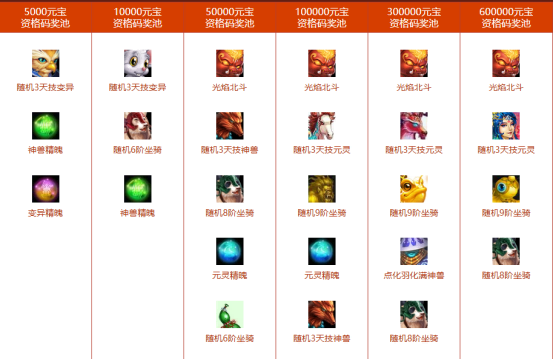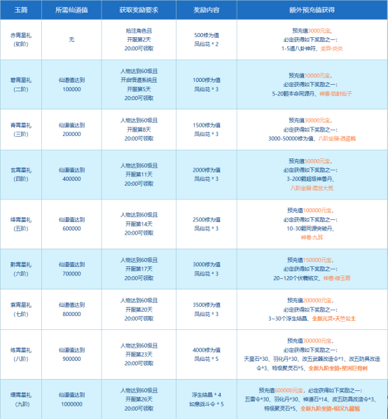 全阶段预充值奖励划分为九阶星礼,从一阶到九阶的预充值奖励分别有几率获得变异·炎炎,神兽·姑射仙子,八阶坐骑·逍遥鹤,八阶坐骑·混世大荒,神兽·九耳,神兽·绿玉君,以及全新元灵·天竺公主,全新九阶坐骑·星河巨骨刺和银汉九曜鲲。