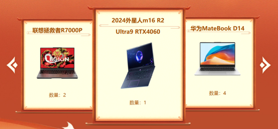 本次预充值大派送活动的奖品阵容也是十分豪华,全新推出的2024款外星人m16 R2 Ultra9、联想拯救者R7000P、华为MateBook D14等重磅数码奖品坐镇奖池!