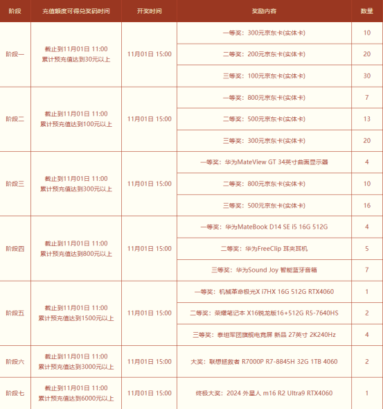 每达到30/100/300/800/1500/3000/6000元的充值额度,都可以获得一个抽奖资格码,最多可累积获得7个抽奖资格码。所有奖品将从抽奖资格码中抽取,各阶段奖励详情及开奖时间请参见活动页面图示。赶快抓住机会,赢取属于您的丰厚奖品吧!