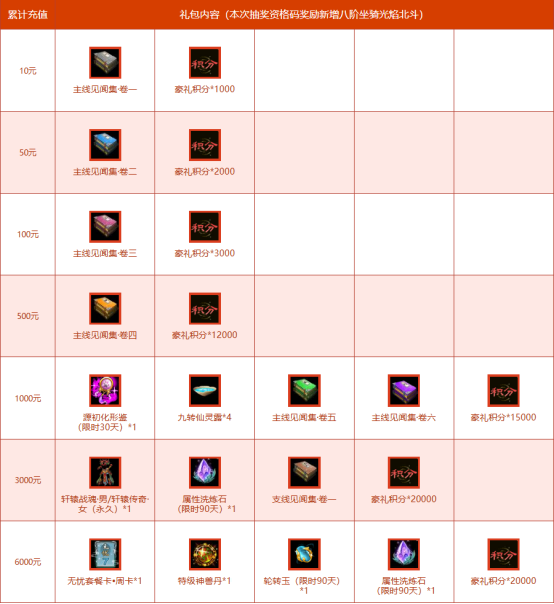 即日起至11月17日,在新服“聚宝龙”进行充值活动,就可以参加累充刮豪礼活动,只要在此期间累计充值金额达到指定标准,即可获得丰厚的充值礼包,内含主线见闻录、九转仙灵露、永久时装“轩辕战魂·男/轩辕传奇·女”、属性洗炼石、轮转玉以及海量豪礼积分等奖励。