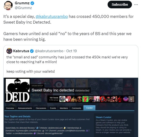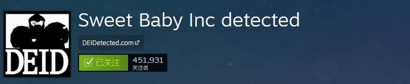 早先为了反对Sweet Baby对游戏的ZZZQ影响,玩家Kabrutusrambo在Steam建立Sweet Baby Inc detected专题页,提醒玩家有哪些游戏受其影响。截至发稿前,已有451931人关注该专题页。