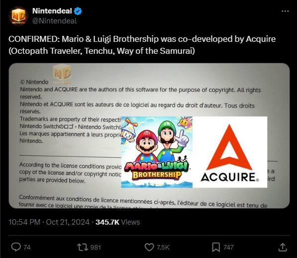 该消息由推特用户“Nintendeal”爆料,其截取的图片似乎是来自eShop的免责声明页面,其中明确地标注了ACQUIRE为《马力欧&路易吉RPG兄弟齐航!》的开发团队。