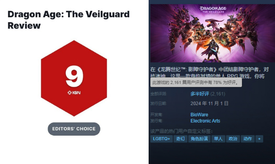 排名第二的《龙腾世纪:影障守护者》,所受到争议性比较大。同为经典IP的最新力作、本身就有着一定的玩家基础,《龙腾世纪:影障守护者》却因为LGBT要素而收到了负面评价。也因为这个原因,游戏的口碑并不算突出。