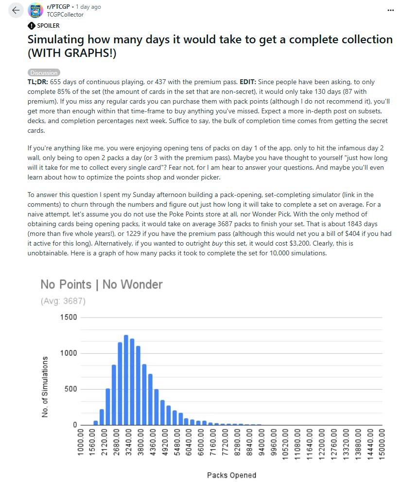 为此,一位严谨的外网玩家就制作了一个模型。通过数据模拟,他计算出了零氪情况下,集齐现有卡包需要多长时间。随后,他将结果发到了Reddit论坛,引发了其他网友们的广泛关注。据计算: